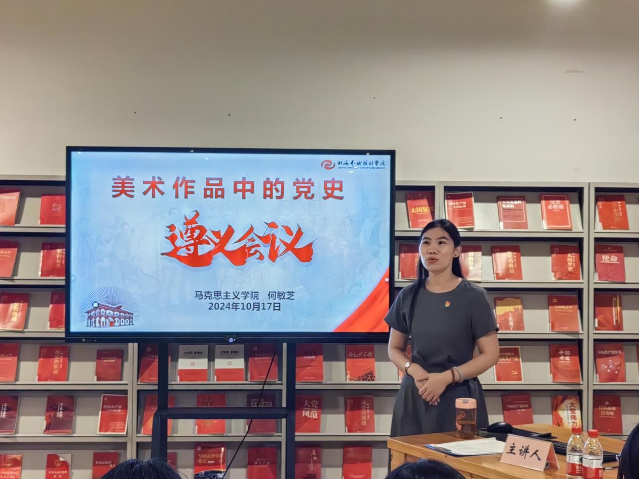 10月17日19:30,何敏芝老师在图书馆三楼“红色阅读角” 举办红色知识专题讲座,本期讲座的主题是美术作品中的党史。(张家梅摄)