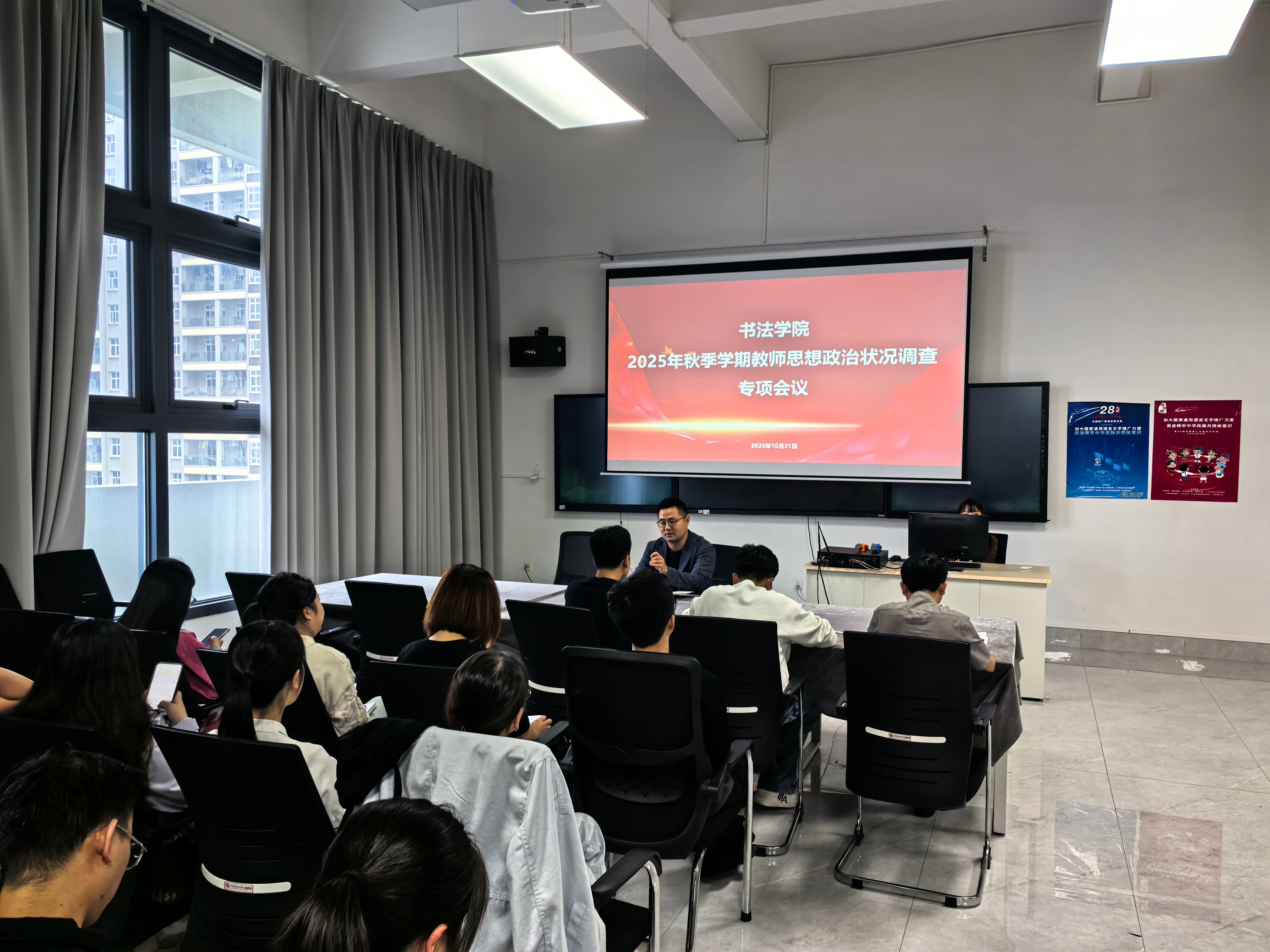 10月31日,书法学院在艺德楼507书法教研室召开专题会议,集中安排2025年秋季学期教师思想政治状况调查、意识形态与校园安全、文化宣传阵地自查自纠等重点工作。会议由党支部副书记左云飞主持,全体教师参加。