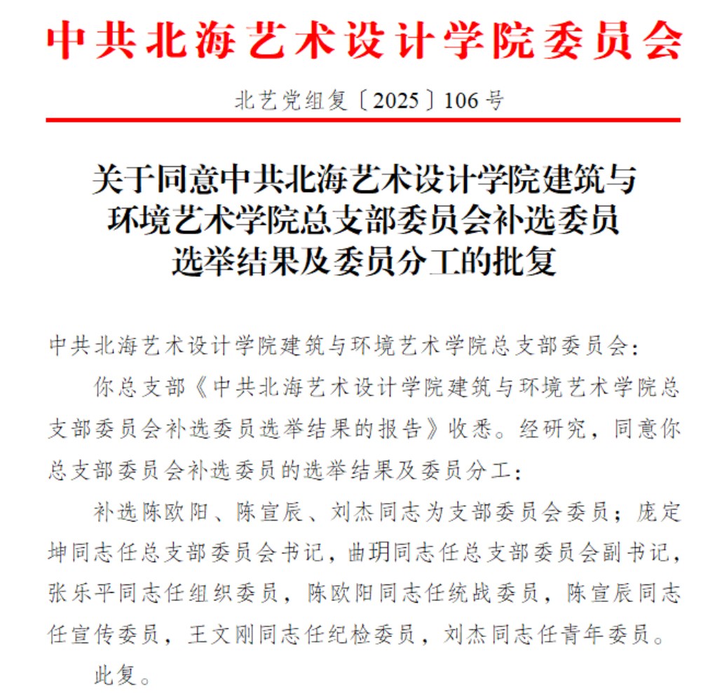 关于同意中共北海艺术设计学院建筑与环境艺术学院总支部委员会补选委员选举结果及委员分工的批复