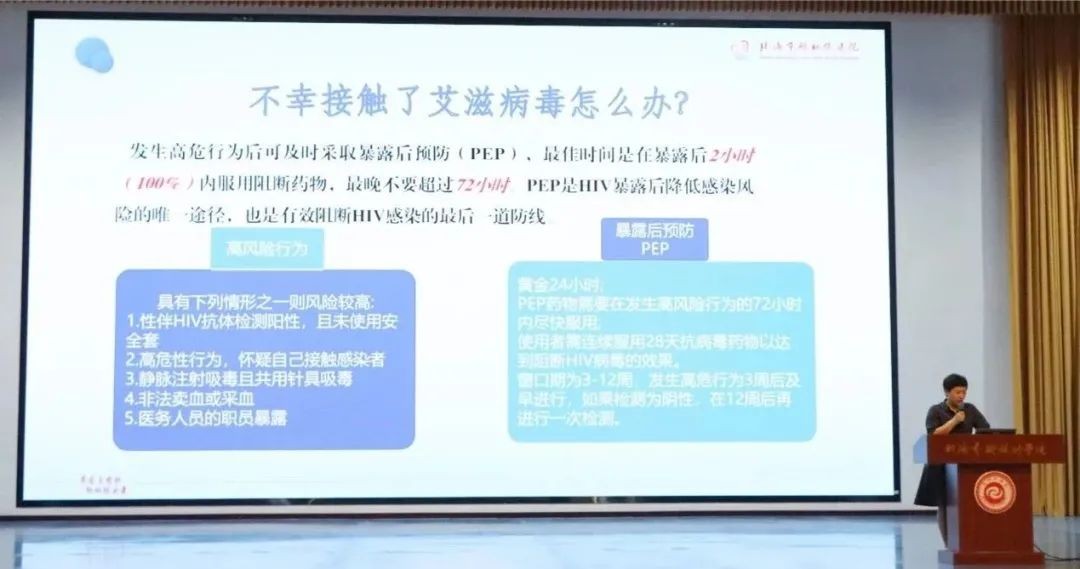 然后张主任向我们讲解了容易感染和传播艾滋病的行为以及感染后的阻断措施。这些丰富的实际经验,让同学们对艾滋病的防范有了更深刻的认知,遇到这些情况的时候也知道怎么避免和处理。