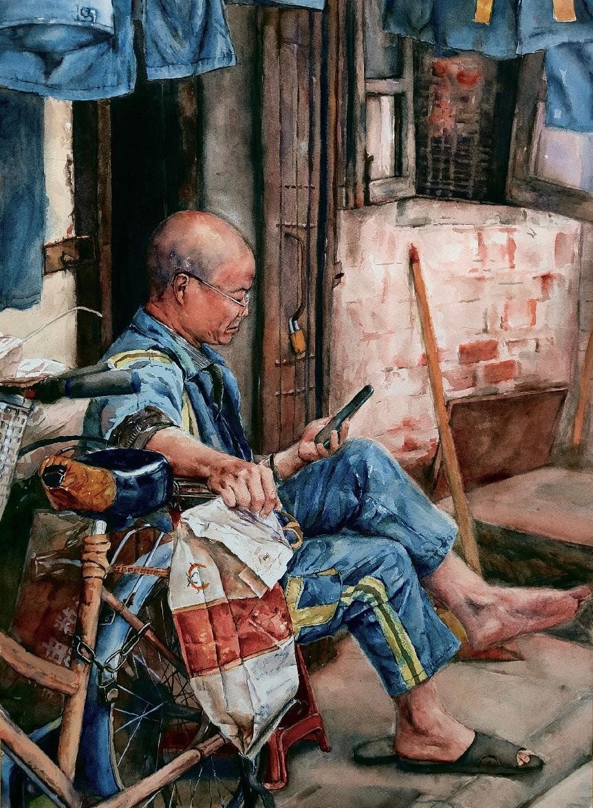 绘画 1906 班 麻镇显《忙碌之余》55×76cm 水彩 指导教师:段凝
