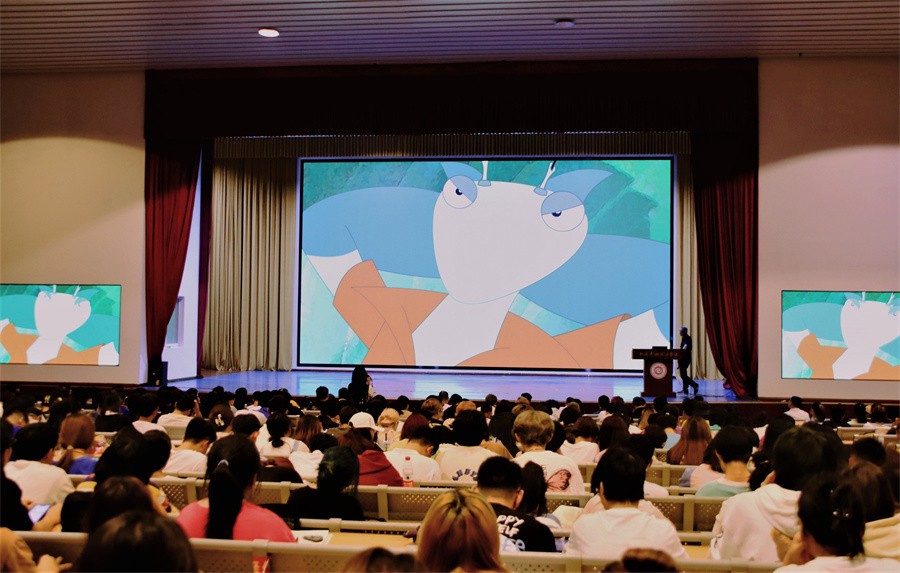 讲座一开始,王钢教授通过播放作品《雁阵》、《昆虫联盟》两部动画作品,详细阐述了中国动画的发展历程。为让在场师生进一步了解体会中国动画发展不同阶段的特点,王钢教授回顾了中国动画的历史,多维度分享了他的从业与创作经历。他表示,今年正值中国动画诞生百年,要珍惜当下的学习环境,时刻怀有一颗热爱动画的心。