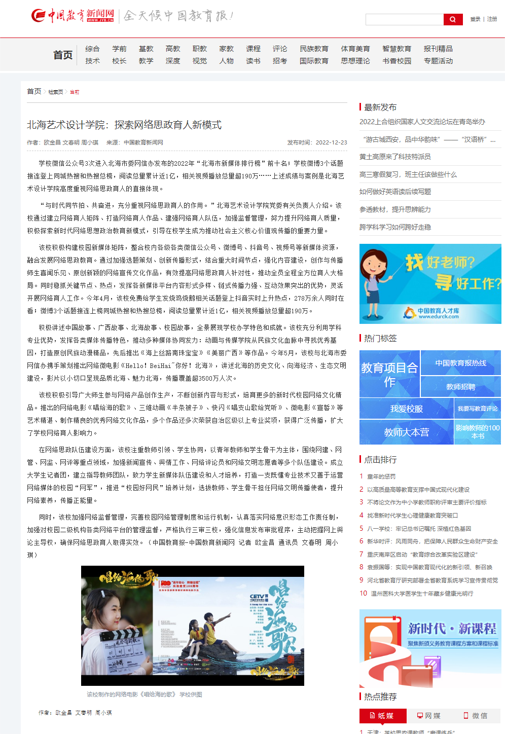 中国教育新闻网:北海艺术设计学院探索网络思政育人新模式