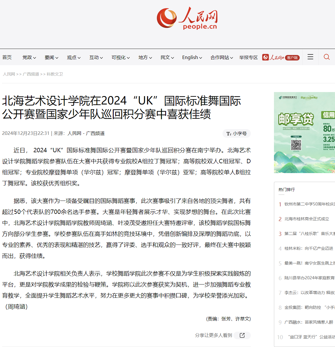 人民网:北海艺术设计学院在2024“UK”国际标准舞国际公开赛暨国家少年队巡回积分赛中喜获佳绩