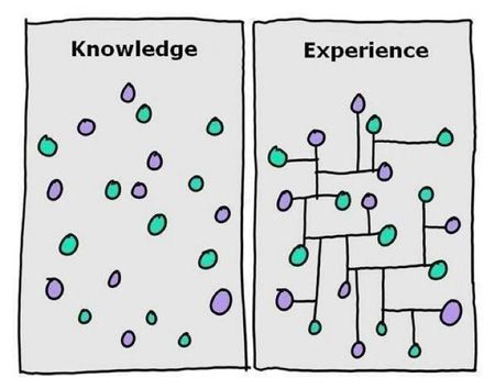 天, Belle Beth Cooper 透过部落格 buffer 的官方帐号在 Twitter 上分享这张图片时,很快地就有超过 1,000 次以上的转推,代表这相当能引起大眾的共鸣,也让她开始思考该如何将知识连结。这张图片清楚地点出知识与经验的不同: