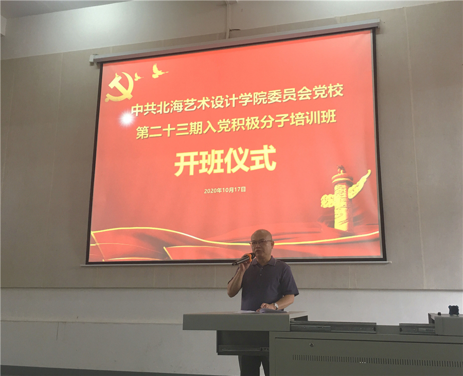 2020年10月17日,学校第23期入党积极分子培训班正式开班,出席开班仪式的领导有学校党委书记、党校校长李高南,党委副书记、党校常务副校长彭仁,党委委员、动画学院党支书书记、常务副院长陶立阳,党委各职能部门负责人,直属党支部书记以及各二级学院党总支、党支部书记。参加本期培训班共有166名学员,其中教师学员16名。开班仪式由视觉传达党支部书记陈莎同志主持。