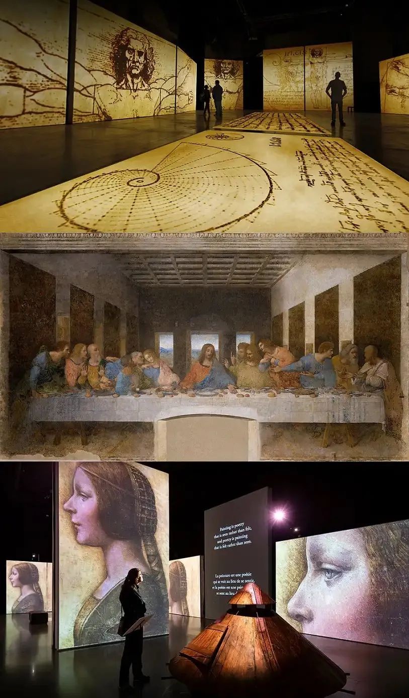 以数字化的方式呈现了达芬奇一生知名的画作、手稿与发明物,通过沉浸式光影和实物展示的方式,重现文艺复兴时期人类艺术与科技的辉煌。观众跟随达芬奇的脚步,一起穿越芬奇镇、佛罗伦萨、米兰、罗马和安布瓦兹,感受他的奇思妙想与绚烂人生。