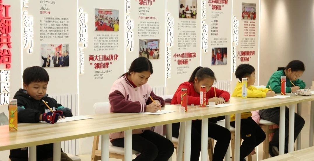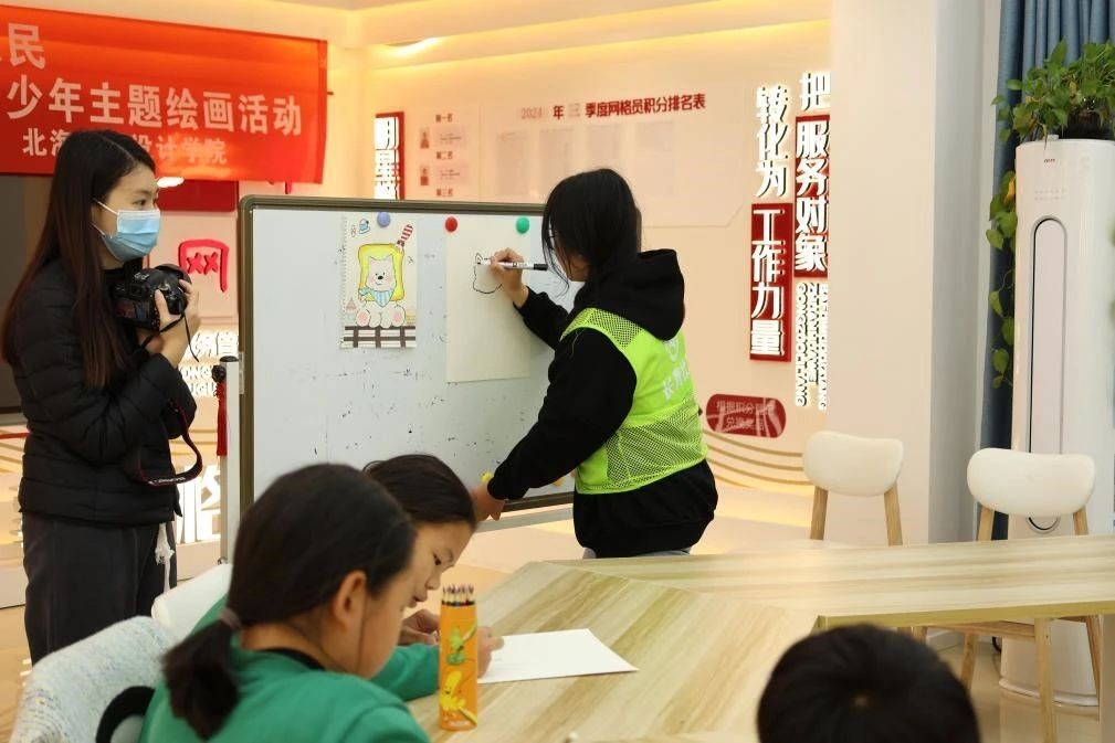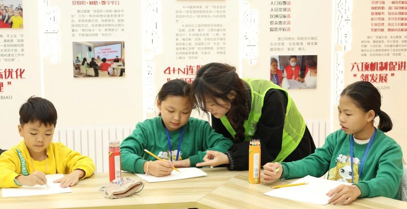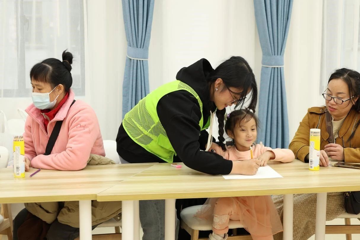 青年志愿者们通过生动的示范和亲切的指导鼓励孩子们自由创作,画出小脑袋里的天马行空。画笔在纸上跳跃,孩子们用色彩表达情感,一幅幅可爱的画作诞生在充满温暖的社区里。