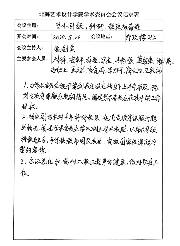 2020520日,北海艺术设计学院学术委员会行政楼212召开上半年工作汇报会议。校长卢新华等校领导出席会议,此次会议由学术委员会秘书蒙剑英主持。