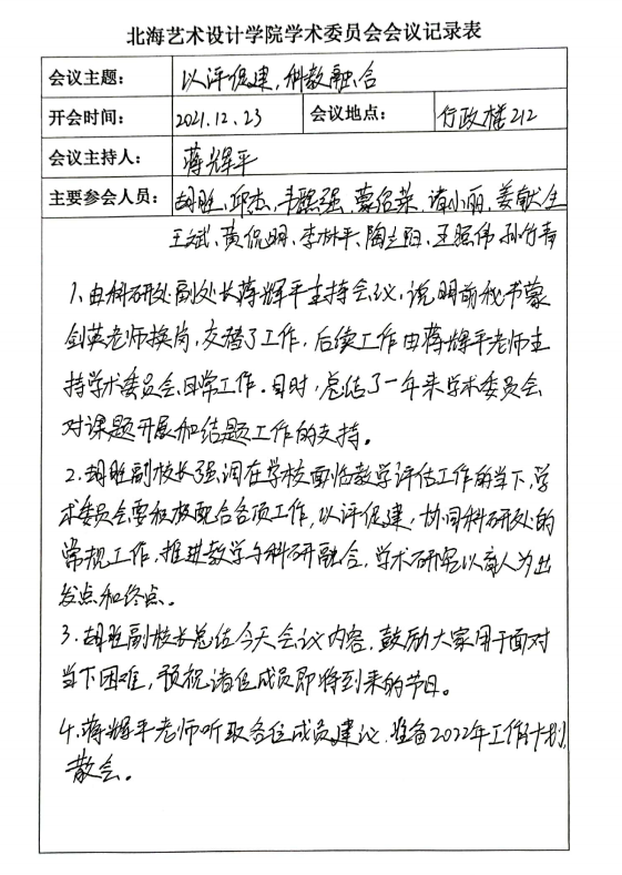 会议上,胡胜副校长宣布了有蒋辉平老师接替蒙剑英老师学术委员秘书工作,蒋辉平秘书总结汇报了2021年各项课题的开题申报工作情况,并认真听取了学术委员会各成员的建议。胡校长强调在学校面临教学评估的当下,学术委员会要积极配合各项工作,以评促建,协同科研处常规工作,推进教学科研融合,学术研究要以育人为出发点和终点。