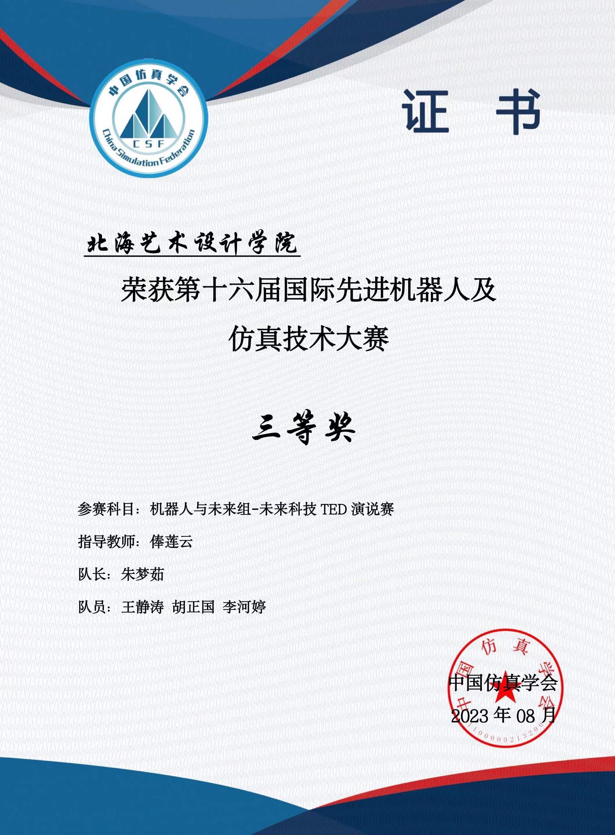2023年3月在江苏太仓,由国际先进机器人及仿真技术大赛组委会举办的国际先进机器人及仿真技术大赛正式开赛。由我院哲学、汉语言文学专业学生李闻晖、程聪远、黄桂秋、胡贞、朱梦茹、王静涛、胡正国、李河婷组成的北海艺术设计学院代表队,在青年教师俸莲云、何广西、莫圆圆的指导下,取得一等奖一项,三等奖两项的好成绩,为我院师生首次在此类大赛中获奖。