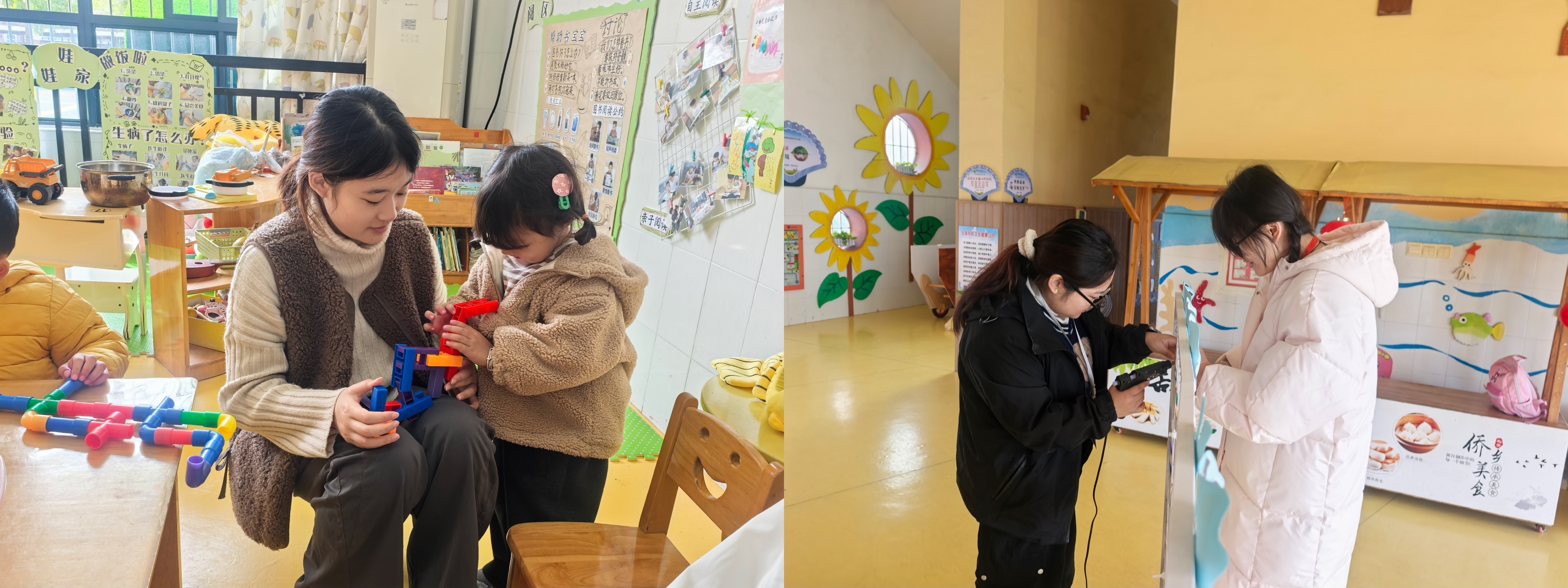 学前2302班冯怡泠组织幼儿开展区域活动         学前2302班廖思雨与宋秋萍参与幼儿园环境创设教育