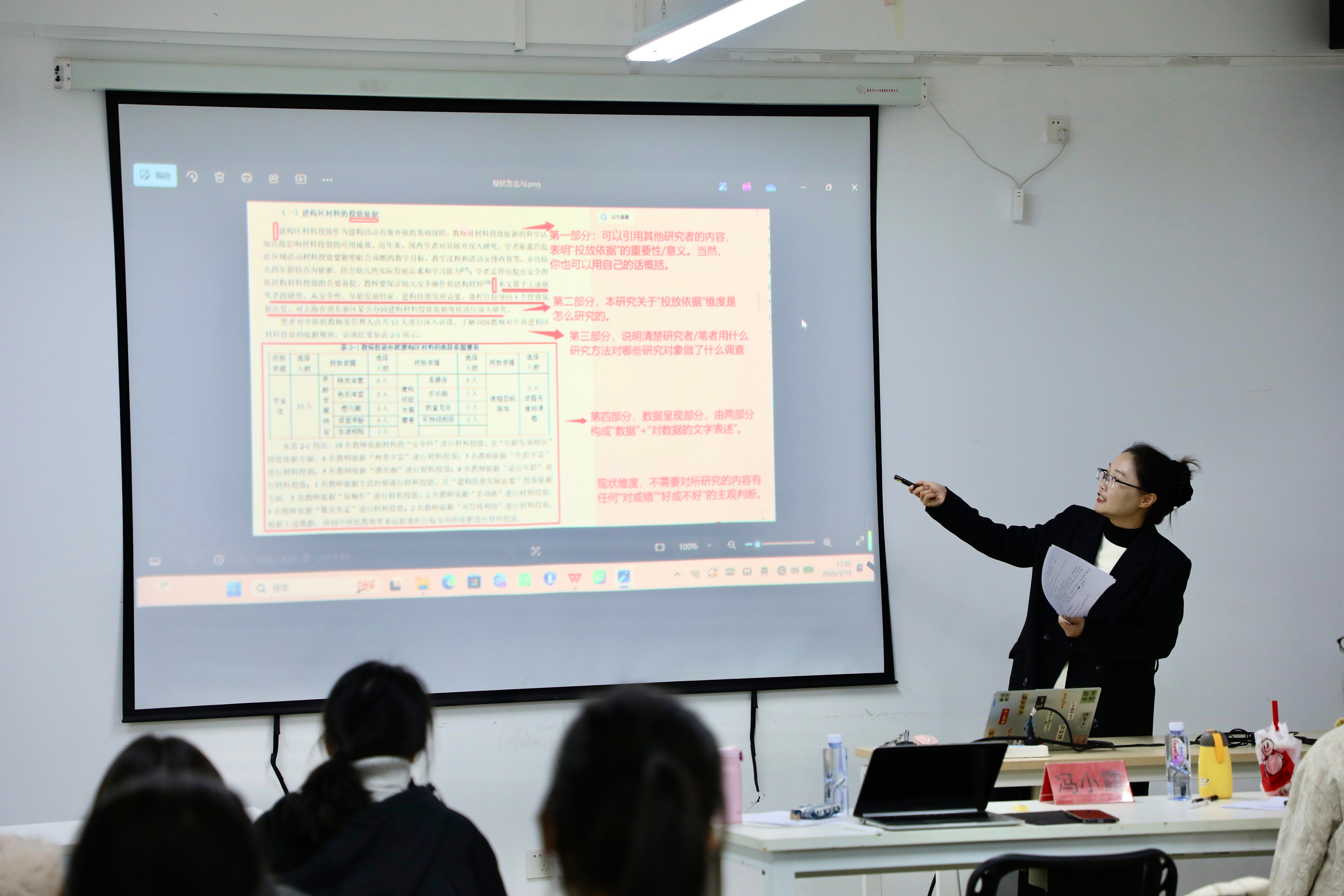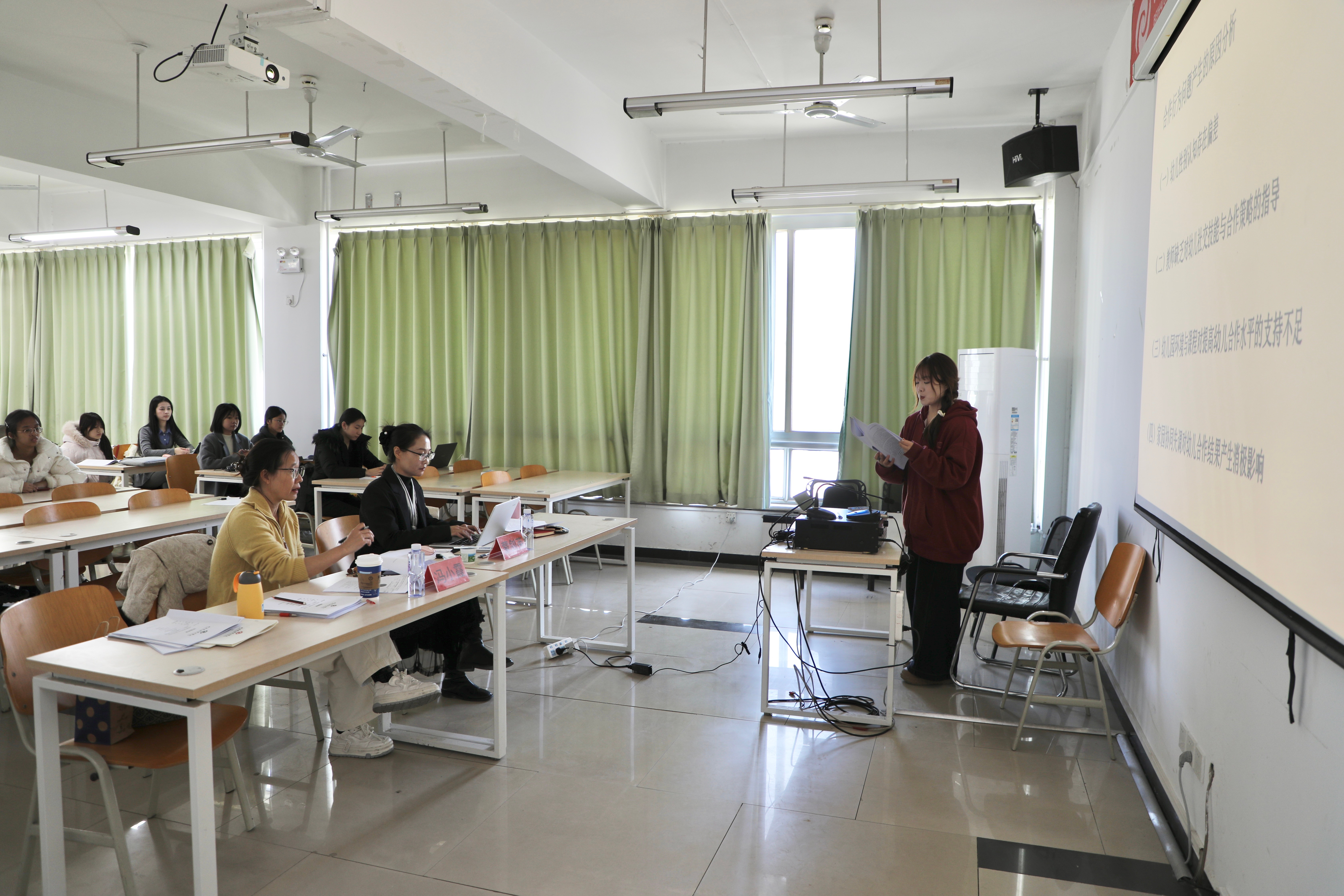 中期汇报会由教育学院北京实践基地班主任雷蕊老师主持,教育学院副院长蒙剑英、实验室主任冯小霞担任答辩评委。全体学前教育专业2026届毕业生逐一就论文完成情况、研究提纲、数据收集、核心内容、存在问题及后续计划等方面进行了系统汇报。
