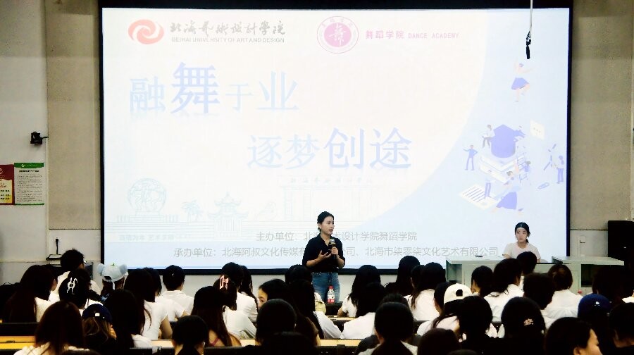 为积极推动舞蹈学院就业创业工作开展,提高大学生就业创业质量,助力2023级舞蹈表演专业学生明晰创就业方向、提升职业核心能力,为赴京实习就业做好充分准备,北海艺术设计学院舞蹈学院组织开展“融舞于业,逐梦创途”就业创业主题分享会,为学生搭建优质的创就业学习交流平台。学院党支部书记宋慧敏、常务副院长邓欢、副院长韦志忍等领导出席活动。北海市青年创业促进会理事、副秘书长、创业导师,北海阿叔文化传媒有限责任公司总经理姚礼泉,广西青年讲师团成员、北海市柒零柒文化艺术有限公司执行董事张晴受邀担任分享嘉宾。舞蹈表演2023级全体学生及辅导员共同参与,活动由学工办副主任黎珈帆主持。