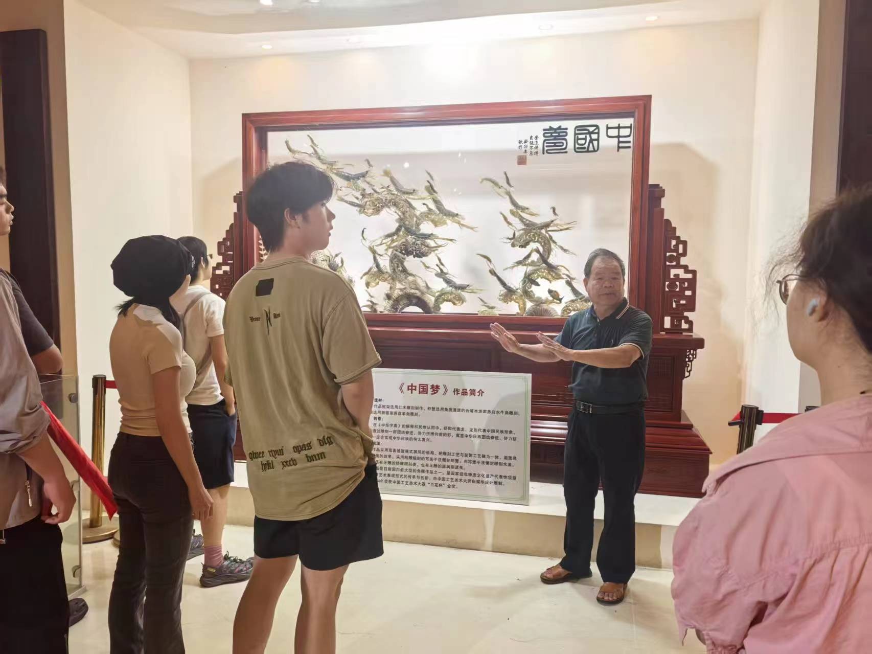 同学们首先来到角雕馆,由国家级非物质文化遗产代表性项目骨角雕(合浦角雕)传承人、中国工艺美术大师白耀华亲自讲解。白耀华大师从事角雕技艺四 十余载,不仅在创作上成就斐然,还在理论研究与传承推广方面做出了突出贡献。 他向学生们详细介绍了角雕工艺的历史渊源,从农耕时期羊角作为辟邪工具,到 唐宋时期犀牛角用作酒器,再到如今角雕成为艺术工艺品并被列入非遗名录的发 展历程。在制作工艺上,白大师讲解了选料、绘图、开料、精雕、打磨、抛光等 复杂工序,并分享了自己在创作中如何创新,如将传统榫卯结构运用到角雕作品 连接中,解决金属固定易生锈问题的经验。同学们被大师的精彩讲解和一件件精 美绝伦的角雕作品所吸引,不时提出问题,白大师都耐心解答。