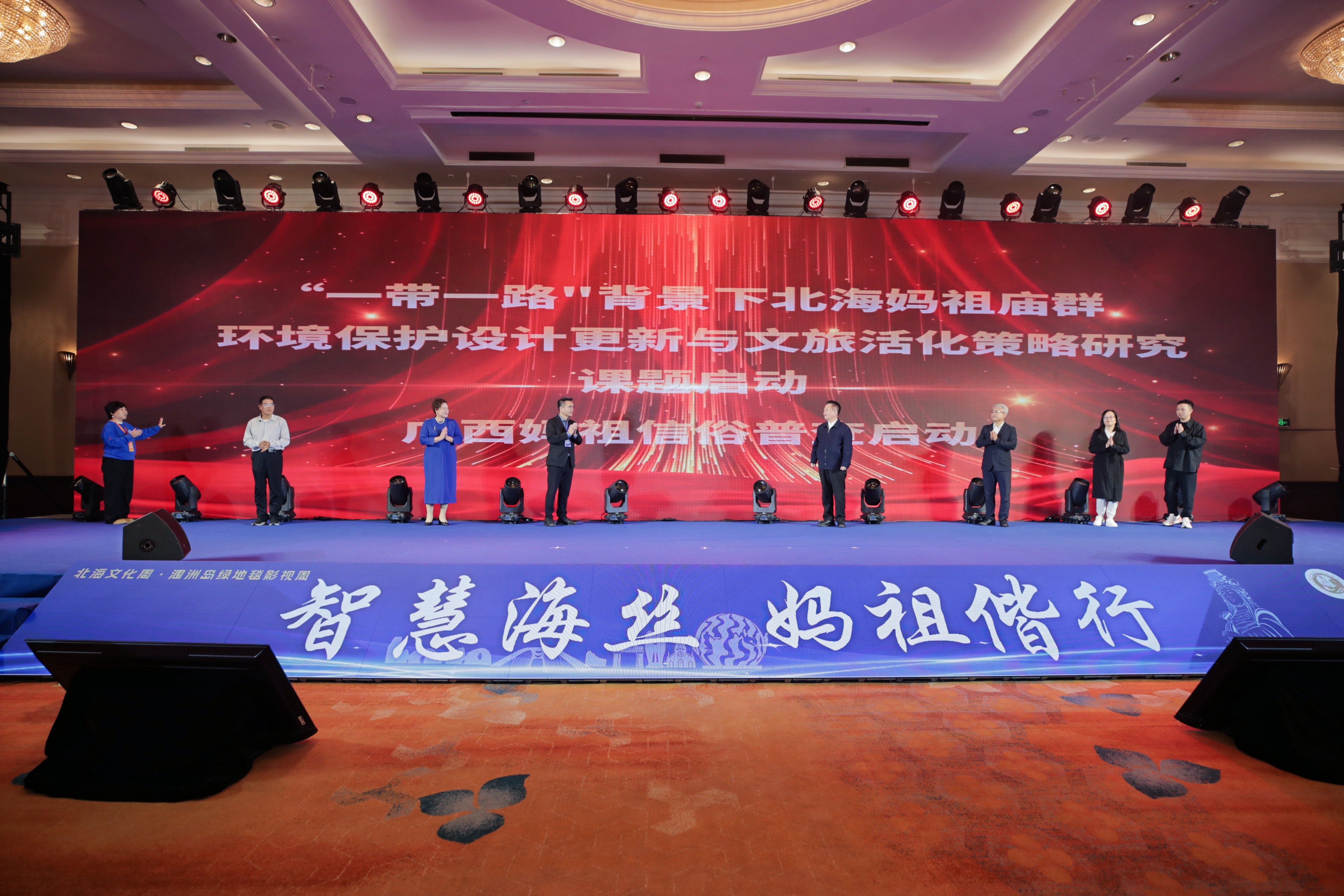 11月24日,广西北海妈祖文化交流协会成立庆典在北海香格里拉大酒店隆重举行,《中华妈祖志・广西卷》编纂筹委会同步揭牌。柬埔寨、新加坡、马来西亚等东盟国家妈祖社团及加拿大、山东、浙江、福建等国内外妈祖文化机构代表齐聚现场,共同见证这一传承海丝文脉、深化跨境交流的文化盛事。建筑与环境艺术学院副院长蔡世伟及教师代表陈欧阳、冀智清受邀出席活动,深度参与妈祖文化传承与发展合作。