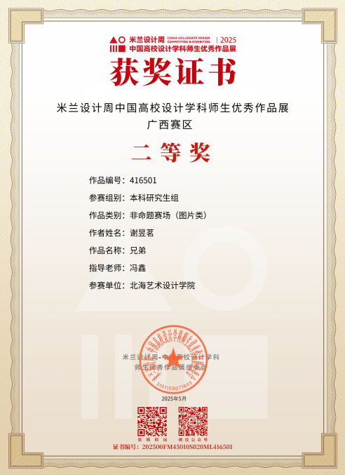 2025年5月 作品《兄弟》获米兰设计周中国高校设计学科师生优秀作品展广西赛二等奖