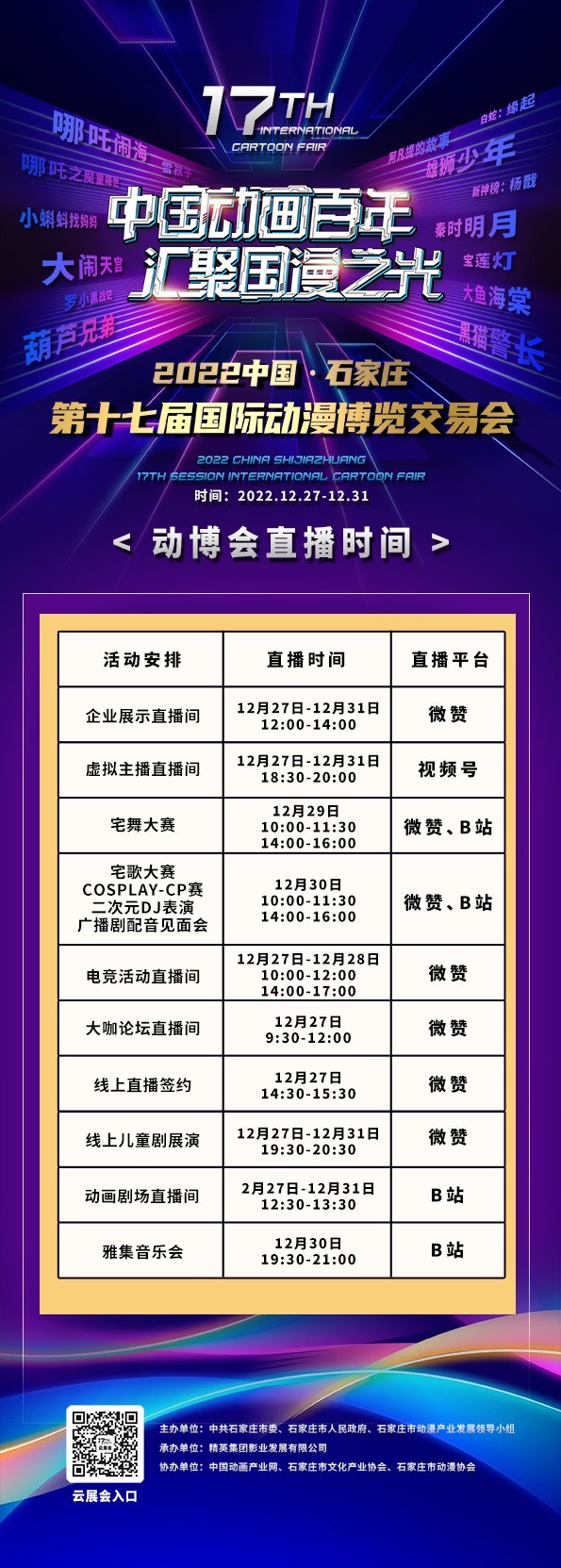 2022中国·石家庄第十七届国际动漫博览交易会云展会于12月27日-31日隆重举办。本届动博会以“中国动画百年 汇聚国漫之光”为主题,由中共石家庄市委、石家庄市人民政府、石家庄市动漫产业发展领导小组主办,精英集团影业发展有限公司承办,中国动画产业网、石家庄市文化产业协会、石家庄市动漫协会协办。