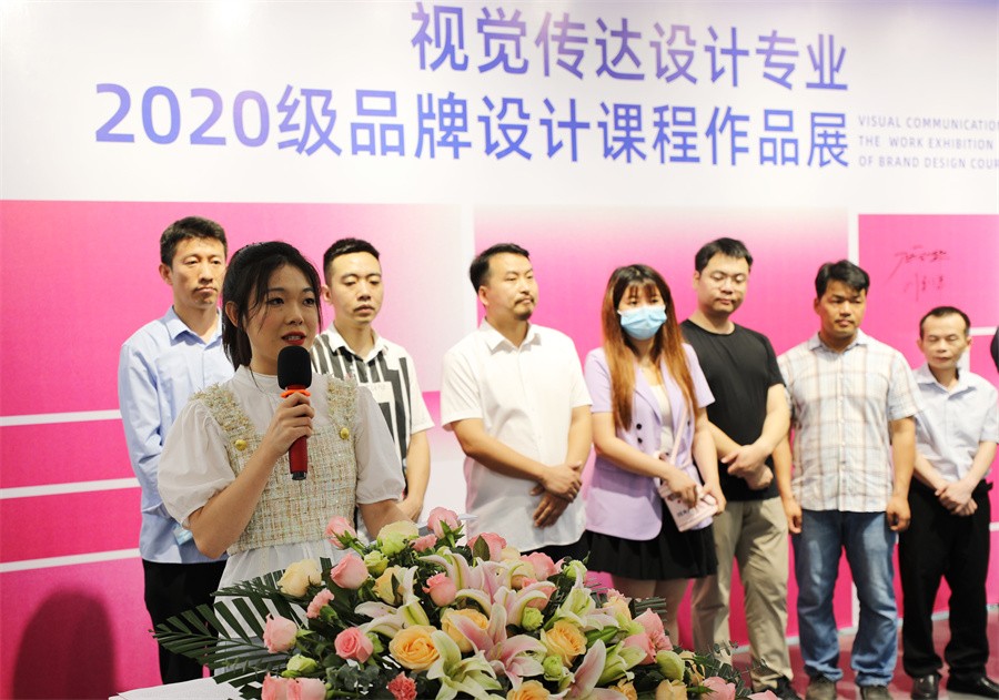 主课教师陈莎介绍了展览的主题、教学设计和教学目的,肯定了学生的设计作品。她表示,此次汇报展作品在秉承设计艺术学院视觉传达设计教研室产教融合、校企合作、服务地方经济建设、服务社会发展需求的教学理念下,通过“视觉”语言把企业品牌具象化,把品牌价值传达给消费者,为企业塑造可持续性的、器宇非凡的品牌视觉形象。
