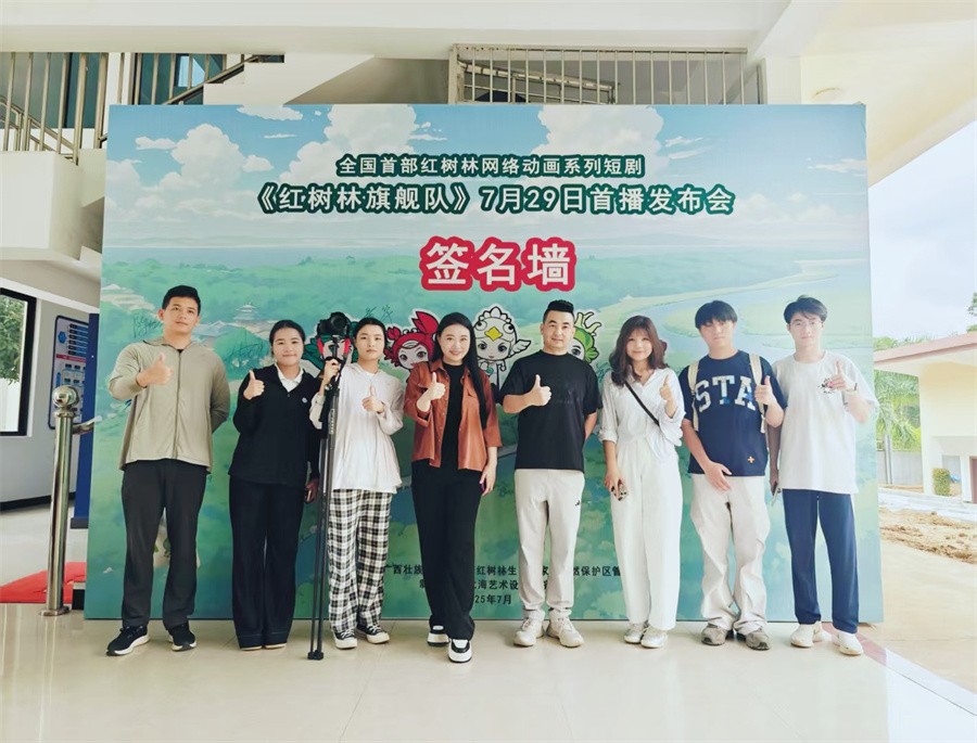 2025年7月29日,全国首部网络系列动画短剧《红树林旗舰队》全网首播发布会在北海成功举行。此次发布会由北海市林业局、合浦县人民政府、广西壮族自治区山口红树林生态国家级自然保护区管理中心联合主办,合浦县林业局、北海艺术设计学院、国核湛江核电有限公司协办。我校影视动画学院参与制作的孙永辉导演,邢舒格编剧受邀请参加影片发布会。