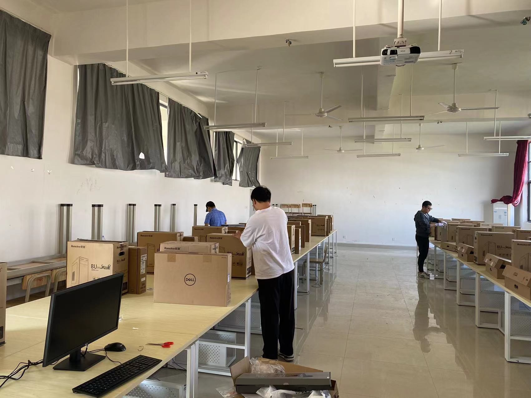 学校西校区公德楼,伦理楼新增20个电子教室,东校区综合楼新增4个电子教室,共960台新电脑,为了电子教室能尽快投入使用,设备与信息处老师加班加点安装新电脑,接入网络,安装系统、机房管理软件,为学校教育教学积极贡献自己的力量。
