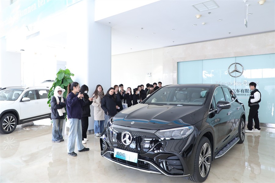 在此次考察活动中,考察团队首先到达北京奔驰汽车有限公司参观了奔驰园区,了解了该公司在汽车设计与技术创新方面的杰出成就。在工作人员的讲解下,学生们深入了解了奔驰的品牌历史、全球布局和在豪华车市场中的领导地位。在展车介绍和体验中,考察师生们还进一步了解了各款车型的性能特点和市场定位,感受了汽车设计的复杂性与精密性,领略了奔驰品牌背后强大的设计哲学和技术积淀。