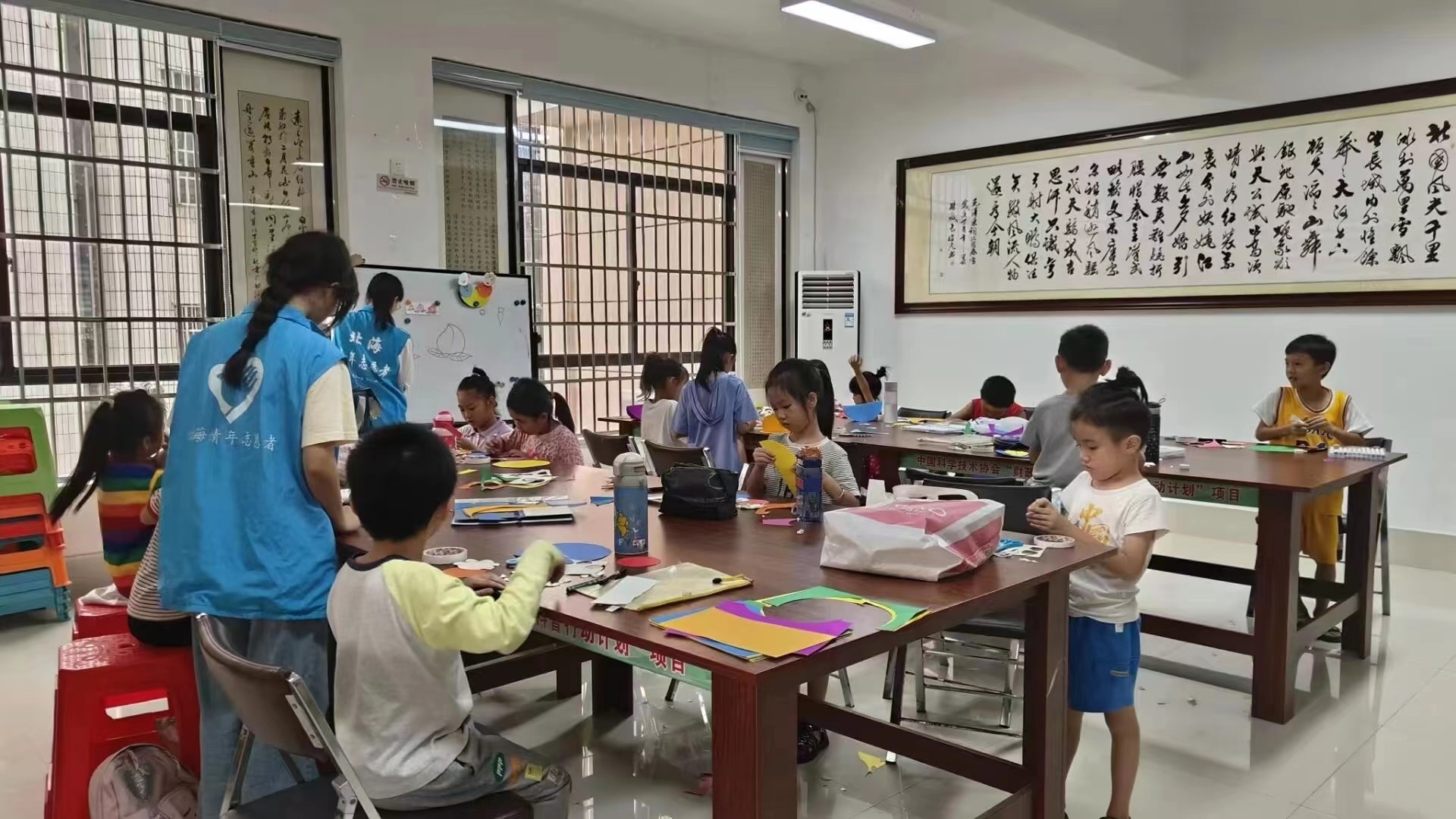 上课啦!孩子们如同初升的朝阳,朝气蓬勃。志愿者们也充当好老师的角色,为课上的孩子们认 真讲课,仿佛浇灌花朵的园丁,殷切地将画画手工知识教给小朋友们,给小朋友带去了无穷的乐趣。随着课程的不断进展,志愿者们细心地辅导着小朋友们,认真解答他们的问题,一次次落下的画笔是小朋友们天马行空的想象,是他们对于这个世界的探索,也是他们初识人生的一步。