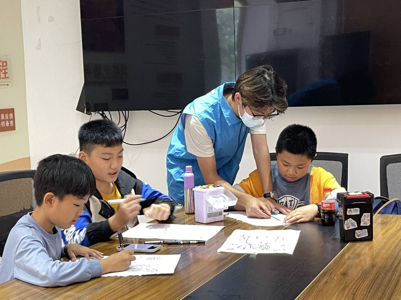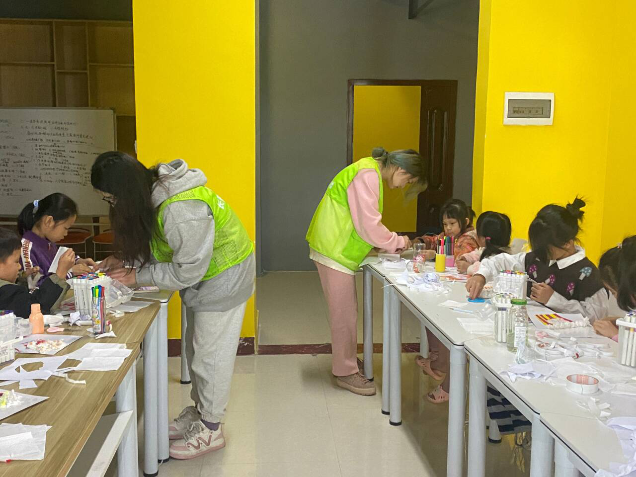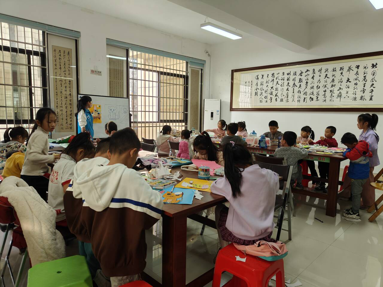除了绘画支教,志愿者们还进行了手工支教。以手造物,以物寄情。志愿者们指导孩子们先在纸面上画出小老虎,以及小老虎背后的各种小元素。接着他们用剪刀在纸上裁出了形状,粘贴在一个背景板上。充满想象力的小老虎就在孩子们的手工中诞生了!